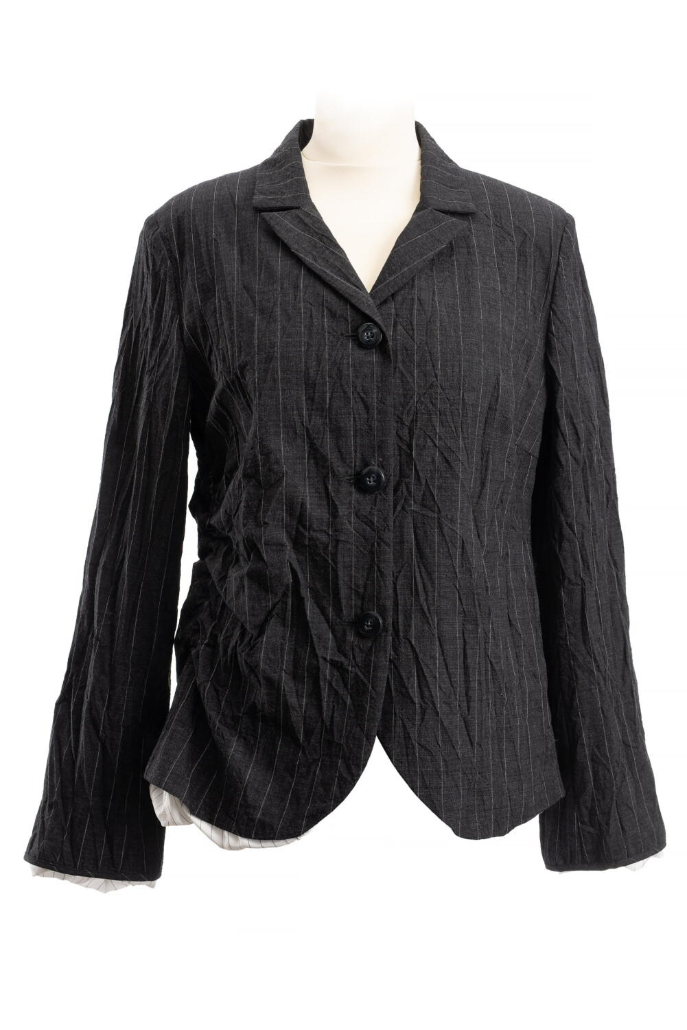 kleiner Blazer mit Taschen in der Seitennaht, kleinem Revers und Raffung an der rechten Seitennaht. gestreiftes Futter schaut raus. 74% Baumwolle, 26% Wolle. Reinigen. Made in Poland.