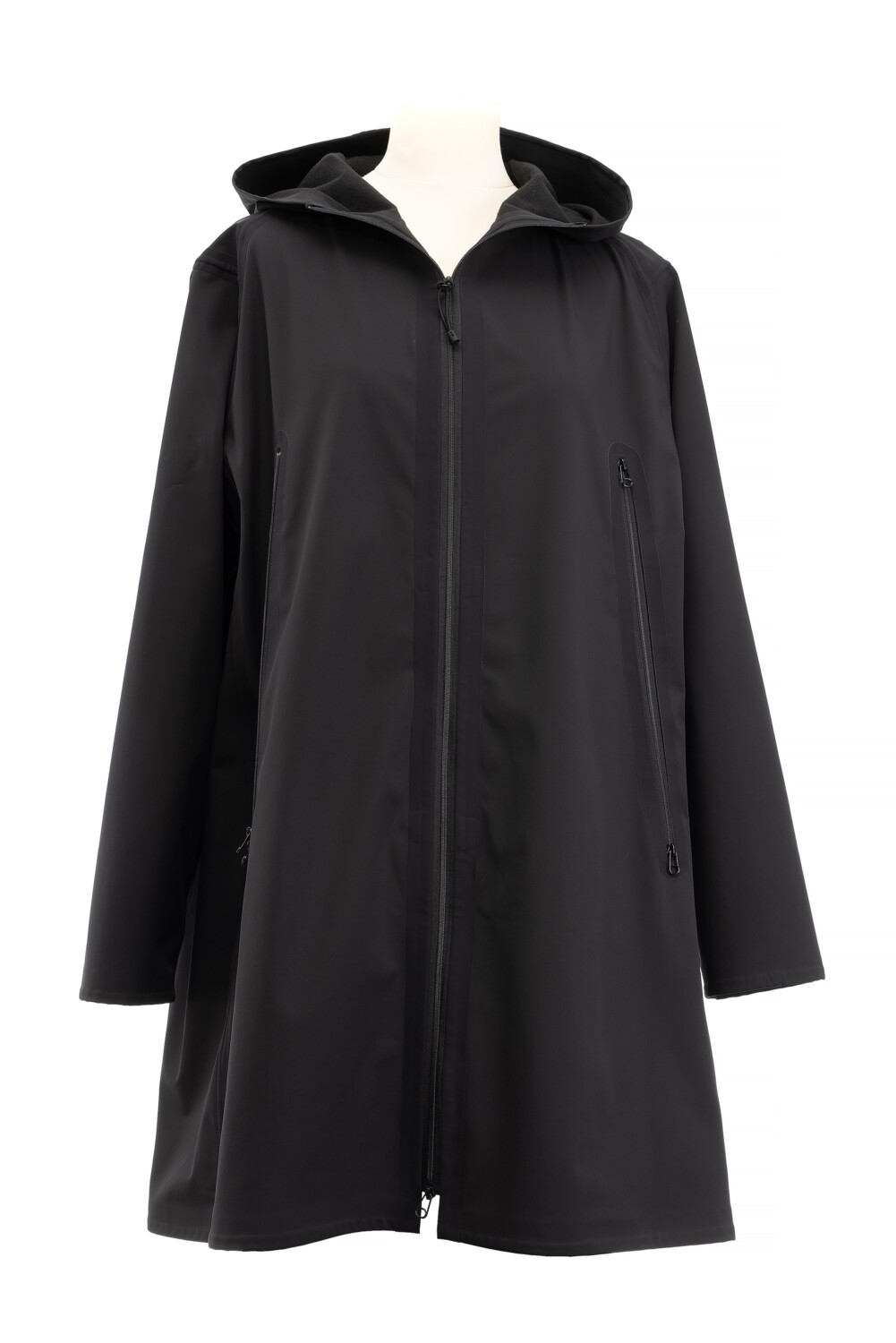 wasserfester Softshell Mantel mit Kapuze, großen Taschen, A-Form. 70% Polyamid, 15% Polyester, 15% Elasthan. Handwäsche. Made in Poland.