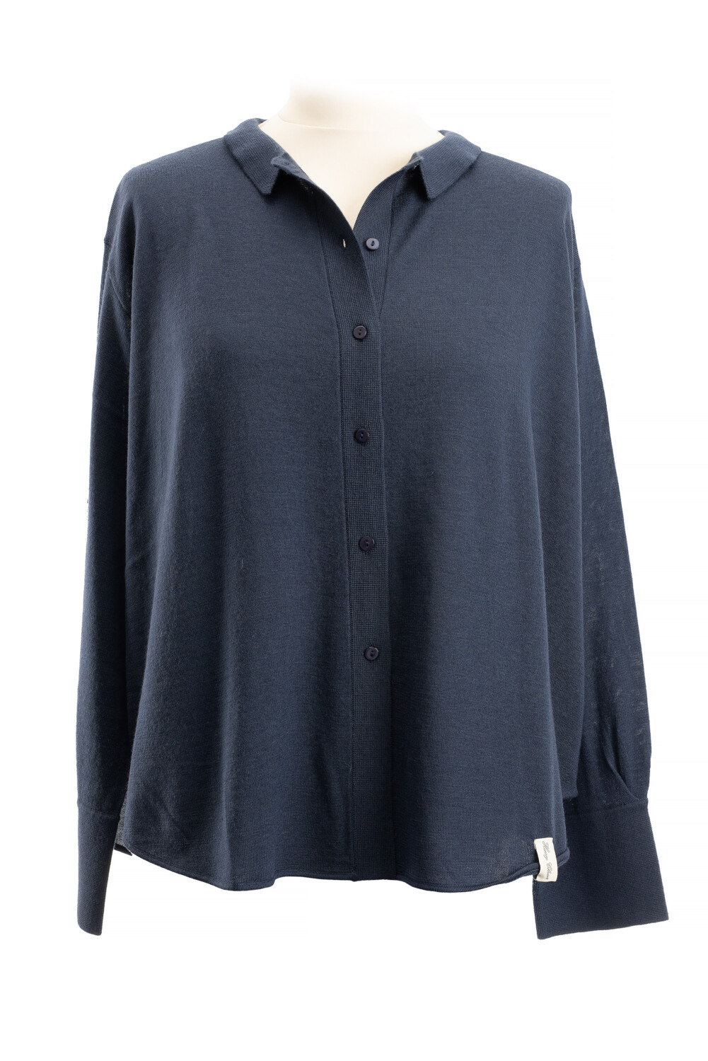 Strickhemd mit Manschette, kleinem Kragen, durchgeknöpt. 100% Wolle ( Merino). Maschinenwäsche kalt.